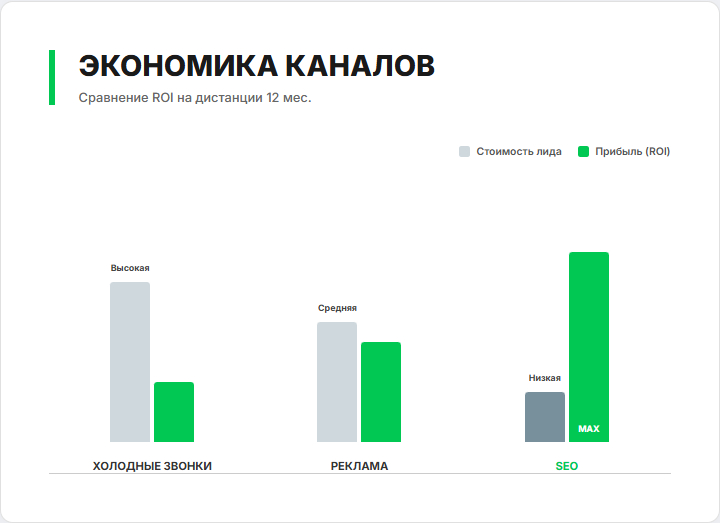 В отличие от контекстной рекламы, где вы платите за каждый клик, и остановка бюджета мгновенно обрубает поток клиентов, SEO работает по инерции. Хорошо сделанный раздел услуг может приносить заявки годами без дополнительных вложений.