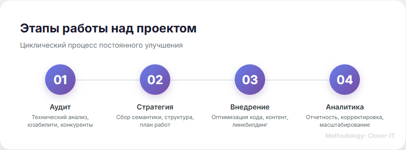 Любая работа над проектом в Clover-It начинается с глубокого технического аудита. Представьте, что вы пытаетесь разогнать гоночный болид (ваш сайт), но у него квадратные колеса и течет масло. Сколько бы топлива (контента и ссылок) вы ни заливали, он не поедет.