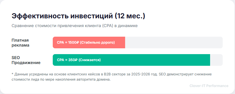 В 2026 году конкуренция в Директе разогрета до предела, ставки перегреты. SEO остается каналом с самым высоким ROI (возвратом инвестиций) на дистанции от 6 месяцев.