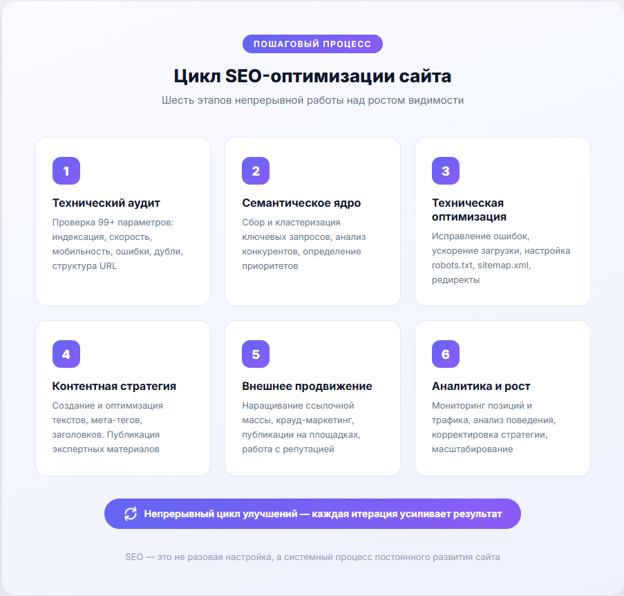 Раскрутка сайта невозможна без комплексной работы. Начинается всё с глубокого аудита: анализ технического состояния ресурса, выявление слабых мест, подбор семантического ядра и разработка индивидуальной стратегии. Далее - техническая и внутренняя оптимизация, повышение скорости загрузки, работа над структурой и юзабилити.