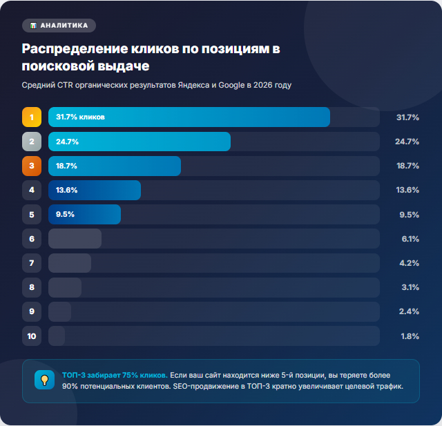 Почему это важно? Представьте ситуацию. Человек вводит в поисковую строку «ремонт квартир под ключ» или «купить диван с доставкой». Он видит 10 результатов на первой странице. Вероятность того, что он перейдёт на сайт из первой тройки - примерно 60-70%. На сайт, стоящий на 7-10 позиции - около 2-3%. А на вторую страницу он, скорее всего, не заглянет вовсе.