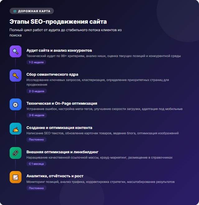 SEO - это не разовое действие, а системный и непрерывный процесс. SEO (Search Engine Optimization) - это процесс оптимизации сайта для повышения его видимости в Яндекс или Google. Рассмотрим каждый этап подробно.