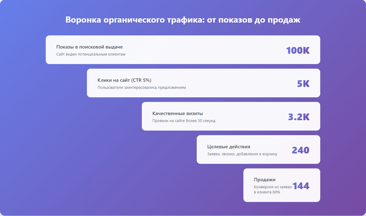 Конверсии из органики - самая важная метрика для бизнеса. Можно быть в ТОПе по сотне запросов, но если это не приводит к заявкам и продажам, продвижение неэффективно.