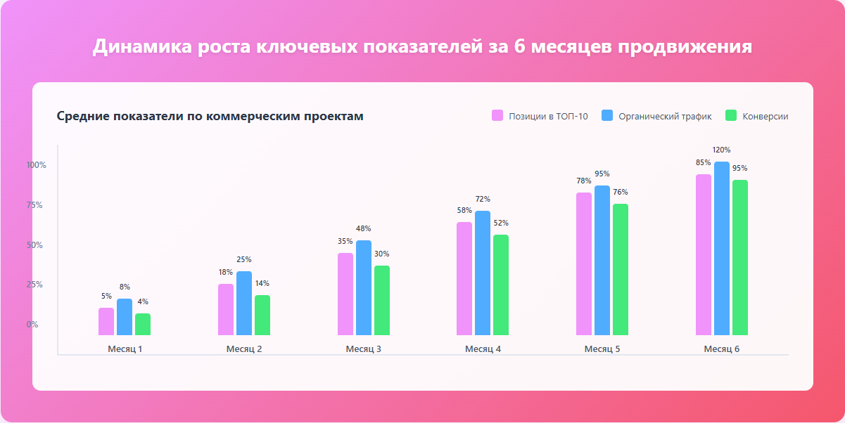 Органический трафик - рост посещаемости из поиска показывает реальную отдачу от оптимизации. При анализе важно учитывать сезонность и общие тренды в нише.