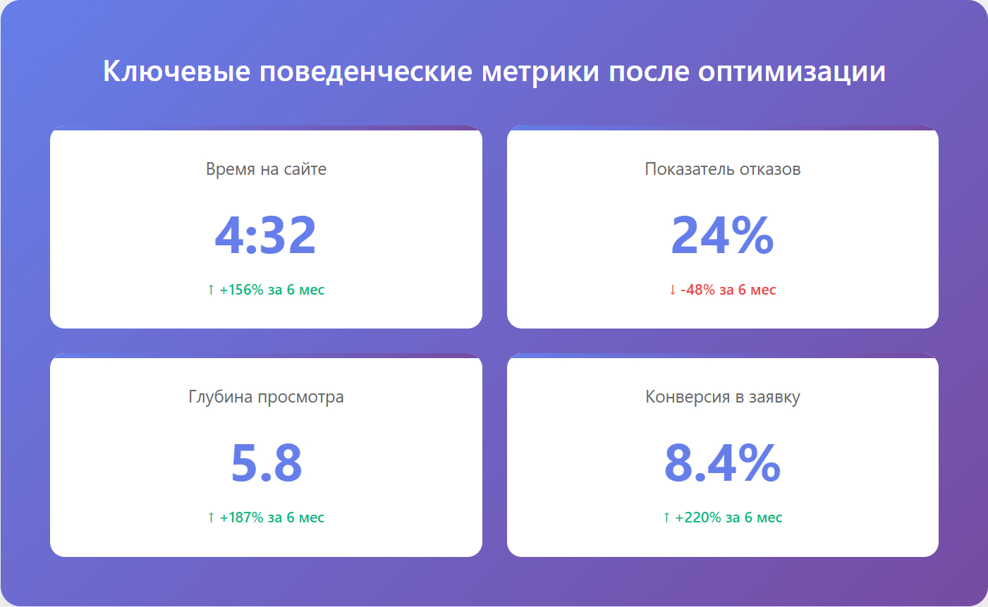 Качественное SEO дает измеримые результаты: рост трафика, увеличение заявок, снижение стоимости привлечения клиента. Давайте посмотрим, какие показатели реально достижимы.