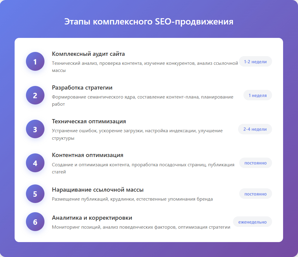 Важно установить реалистичные сроки. В низкоконкурентных нишах первые результаты видны через 2-3 месяца, в высококонкурентных - через 6-8 месяцев. SEO - это марафон, а не спринт.