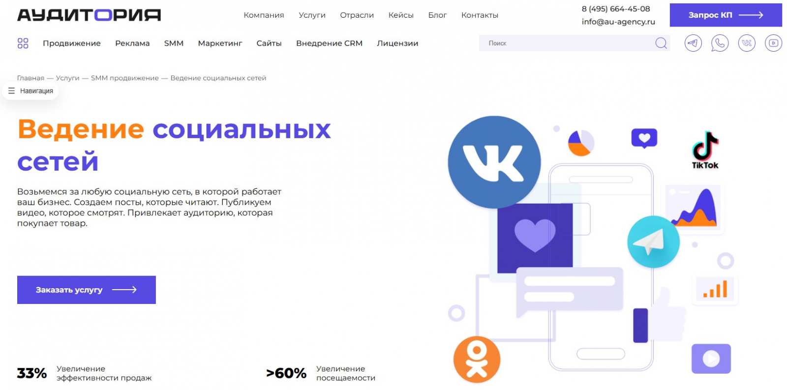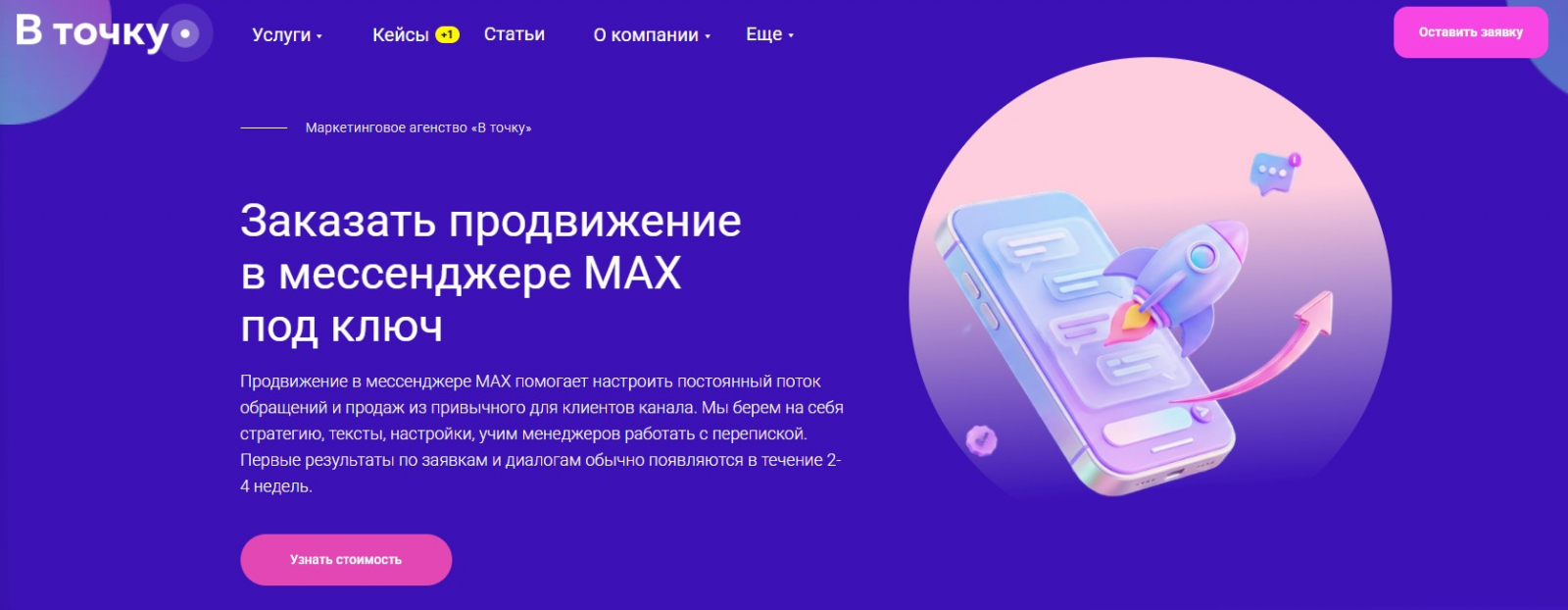 Агентство занимается комплексным продвижением, в перечень услуг входит также оформление и ведение социальных сетей. Прямого указания на MAX в материалах на сайте нет, но указано, что специалисты возьмутся за любую соцсеть, где вы ведете бизнес. После оставленной заявки на продвижение в MAX представитель агентства быстро связался и предложил обсудить подробности в ходе созвона.
