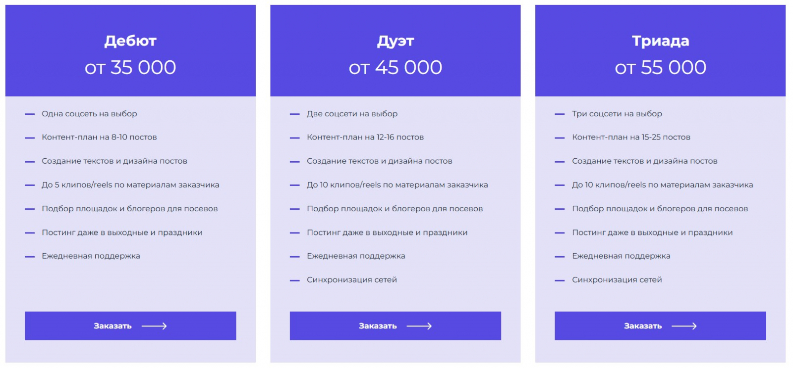 Стоимость продвижения начинается от 35 000 рублей. Сюда входит одна соцсеть, контент-план на 8-10 постов, создание текстов и дизайна постов, до 5 клипов, подбор площадок для посевов и ежедневная поддержка.