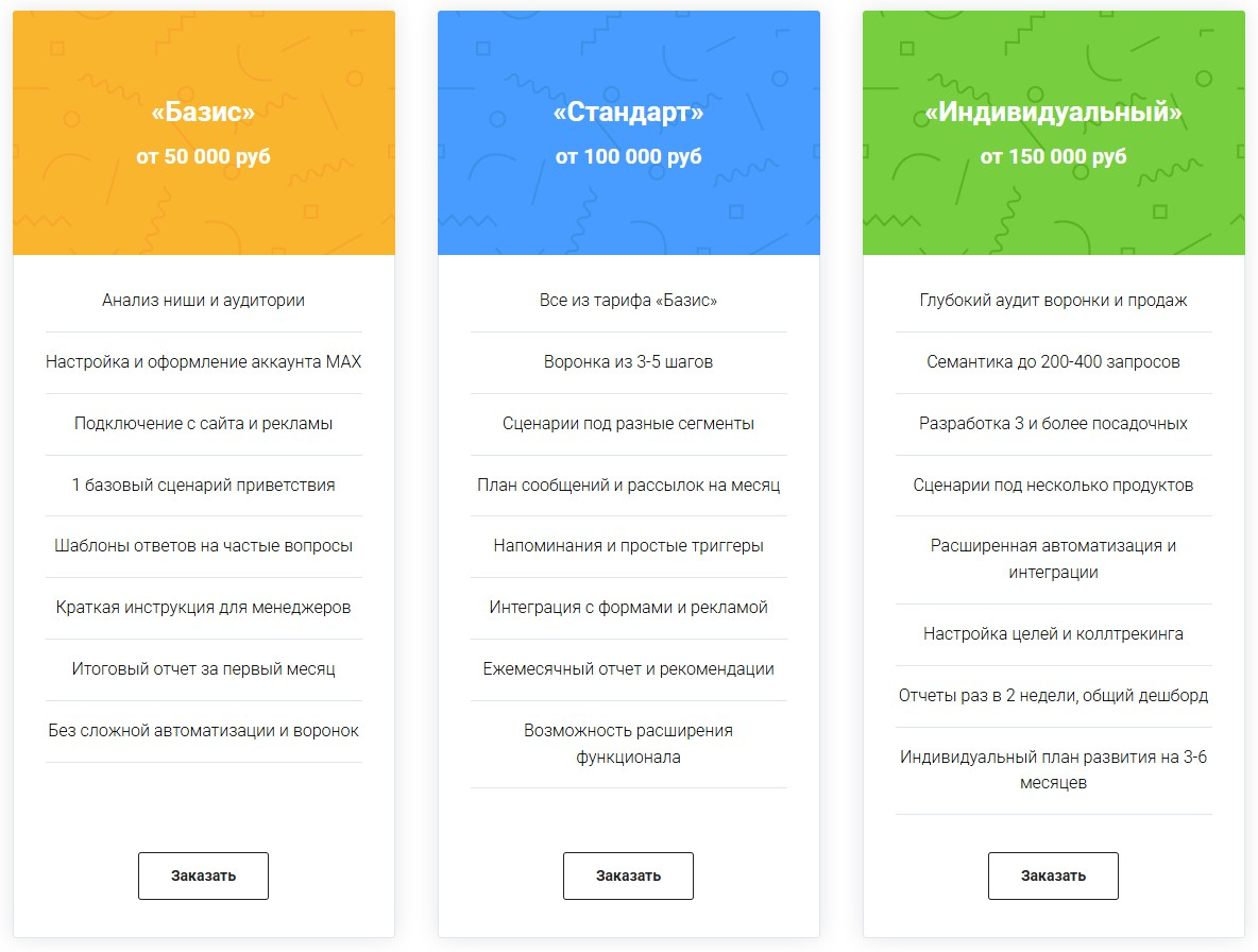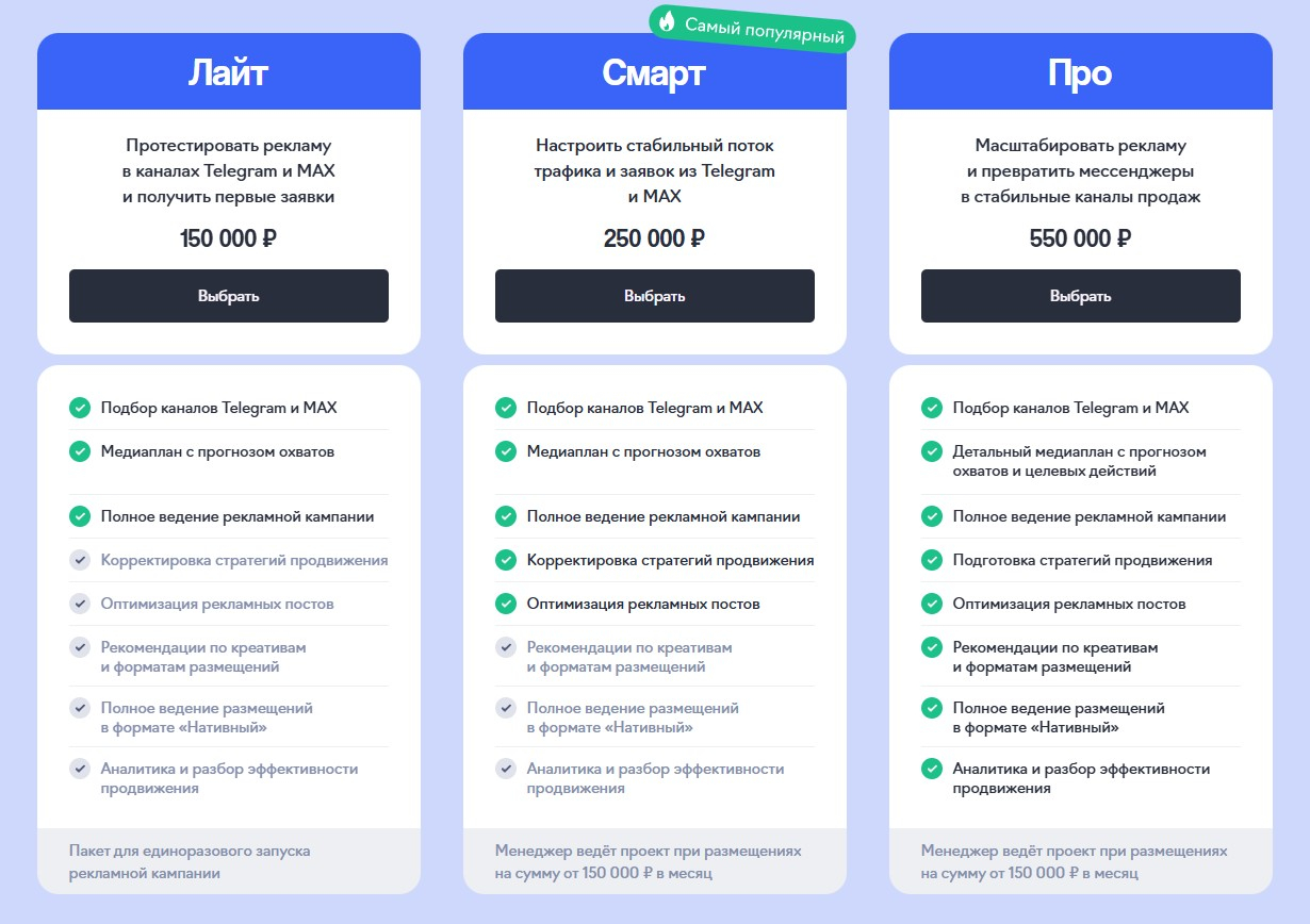 На сайте представлено три тарифа. Цены начинаются от 150 000 рублей.