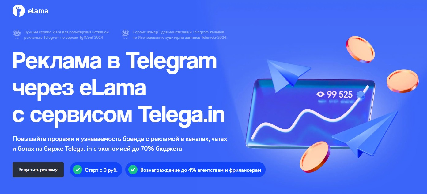 Агентство для запуска рекламы в Telegram и MAX. Работает на базе Telega.in — каталога каналов и платформы для размещения нативной рекламы. Сервис eLama позволяет быстро запускать рекламные кампании у блогеров и владельцев каналов без длительных переговоров, ручной проверки площадок и сложной отчетности.