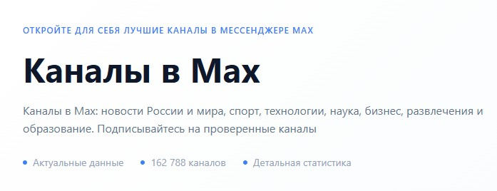 Крупнейший, по заявлениям самой площадки, независимый каталог каналов мессенджера MAX с актуальной статистикой и аналитикой. Сервис помогает пользователям находить интересные каналы, а авторам — продвигать контент. В каталоге более 100 000 каналов с общей аудиторией свыше 33 млн подписчиков.