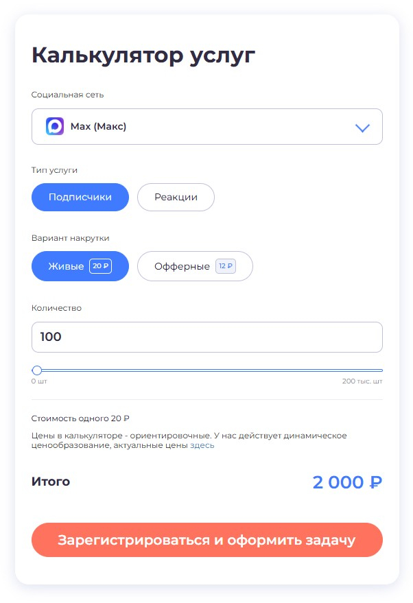 Для точного расчета на сайте предусмотрен калькулятор. Просто выбираете нужную соцсеть и тип услуги, затем вводите количество.