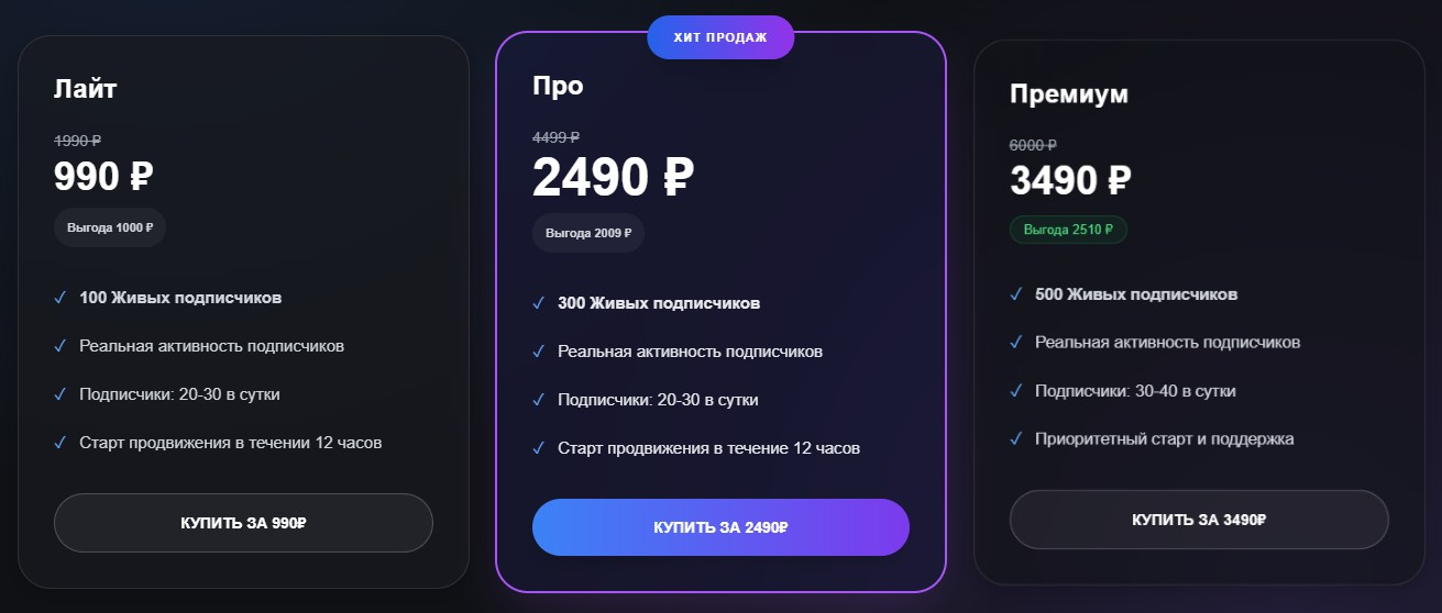 Доступно три тарифа. За 990 рублей вы получите 100 подписчиков, за 2490 рублей — 300, а за 3490 рублей — 500.
