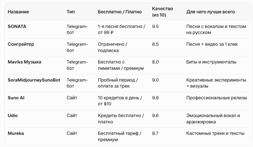 Какой сервис попробуете первым? Напишите в комментариях свою идею песни — поможем с промптом!