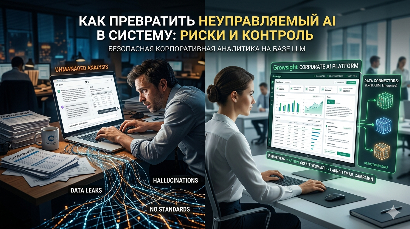 Типичный сценарий прост: менеджер выгружает сделки за месяц, вставляет в чат, просит найти причины просадки конверсии и сформулировать рекомендации. Через неделю другой сотрудник делает то же самое, но по-другому формулирует запрос, берёт другой срез данных и получает другой ответ. Никаких стандартов, никакой воспроизводимости, никакого контроля качества. И самое неприятное — руководитель часто видит только красивый текст «выводов», не видя, какие именно данные и допущения лежали в основе.