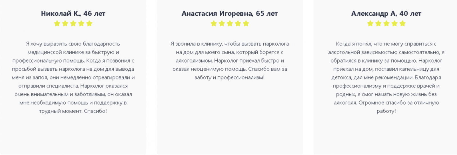 Наши пациенты в отзывах чаще всего отмечают оперативный выезд врача, внимательное отношение и ощутимое облегчение состояния уже после первых процедур. Многие также подчеркивают профессионализм специалистов и благодарят за реальную помощь в сложный момент, которая помогла сделать шаг к жизни без алкоголя.
