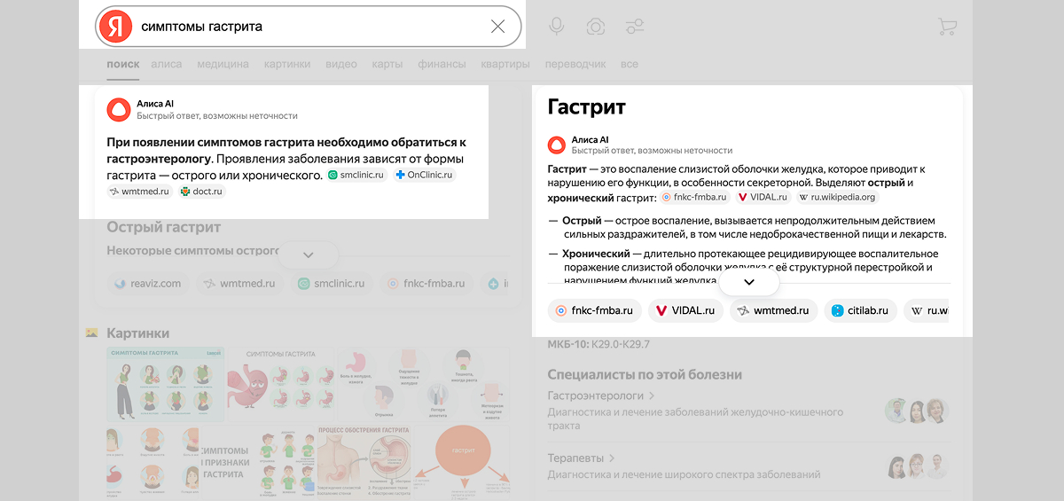 AI-блоки являются частью выдачи и занимают весь первый экран. Когда пользователь вводит запрос, алгоритм анализирует множество источников и формирует готовый ответ прямо на экране. Органическая выдача при этом смещается ниже.