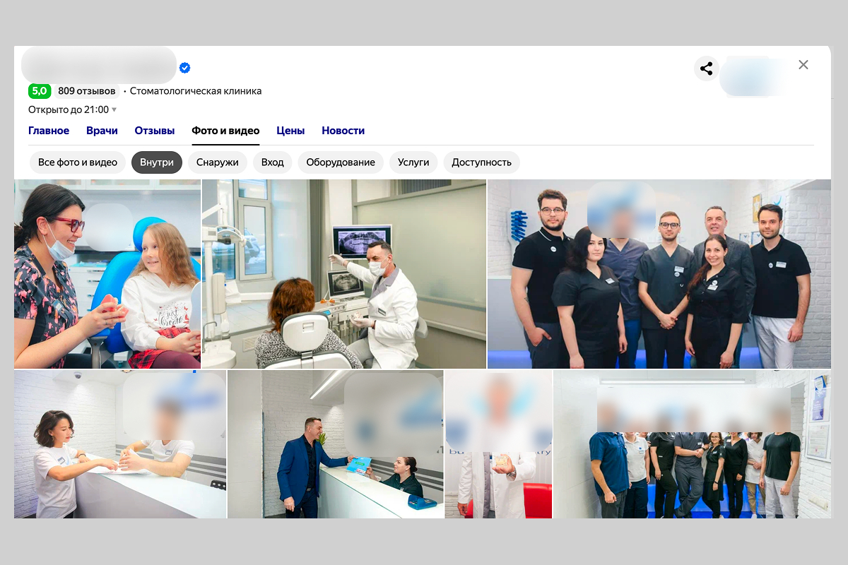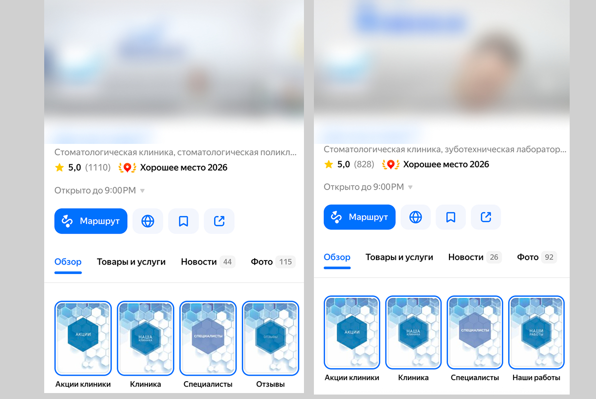 На старте клиника уже присутствовала в Яндекс Картах, но карточки работали как статичная витрина, а не как инструмент привлечения. Профили не использовали весь потенциал платформы. Наполнение было формальным, ответы на отзывы — нерегулярными, а контент — практически отсутствовал.