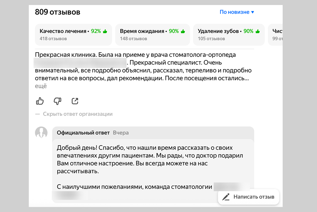 Особое внимание уделили работе с необоснованными отзывами. Если отзыв содержал недостоверную информацию или признаки конкурентной атаки, подавались жалобы по регламентной процедуре. В результате у одного из филиалов удалось добиться удаления нескольких некорректных отзывов, что позволило сохранить высокий рейтинг карточки.