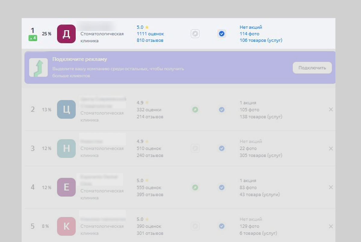 Аудит показал, что карточки клиники не конкурируют за внимание пациентов в районе присутствия. Мы выделили пять системных проблем: