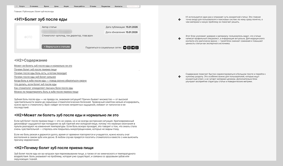 Мы переработали страницы услуг — усилили их релевантность и полноту, а также развили блог, создав материалы под ранний этап выбора пациента.