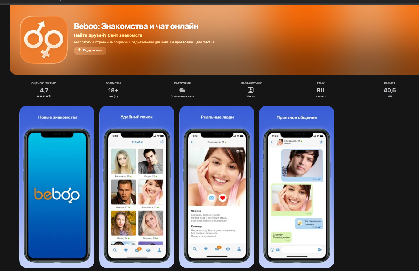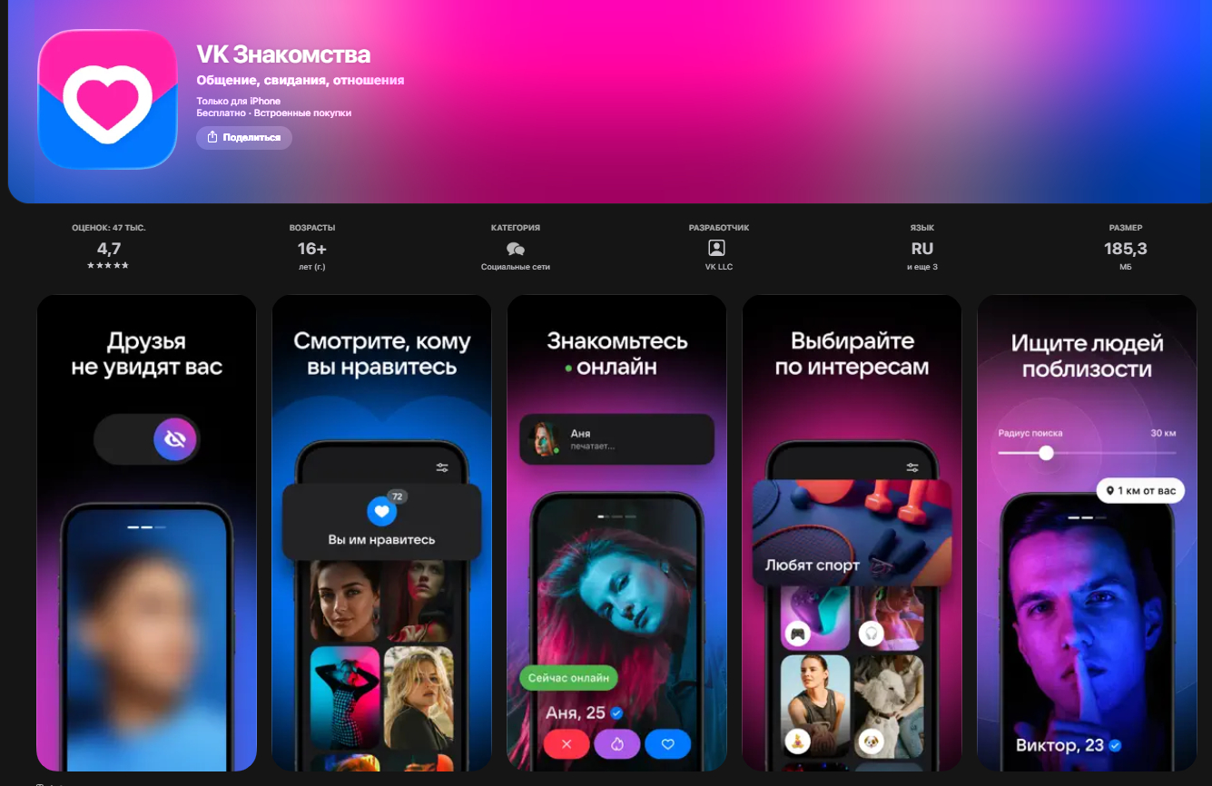 - Описание: знакомства на базе соцсети: меньше трения на старте, если вы уже в VK.