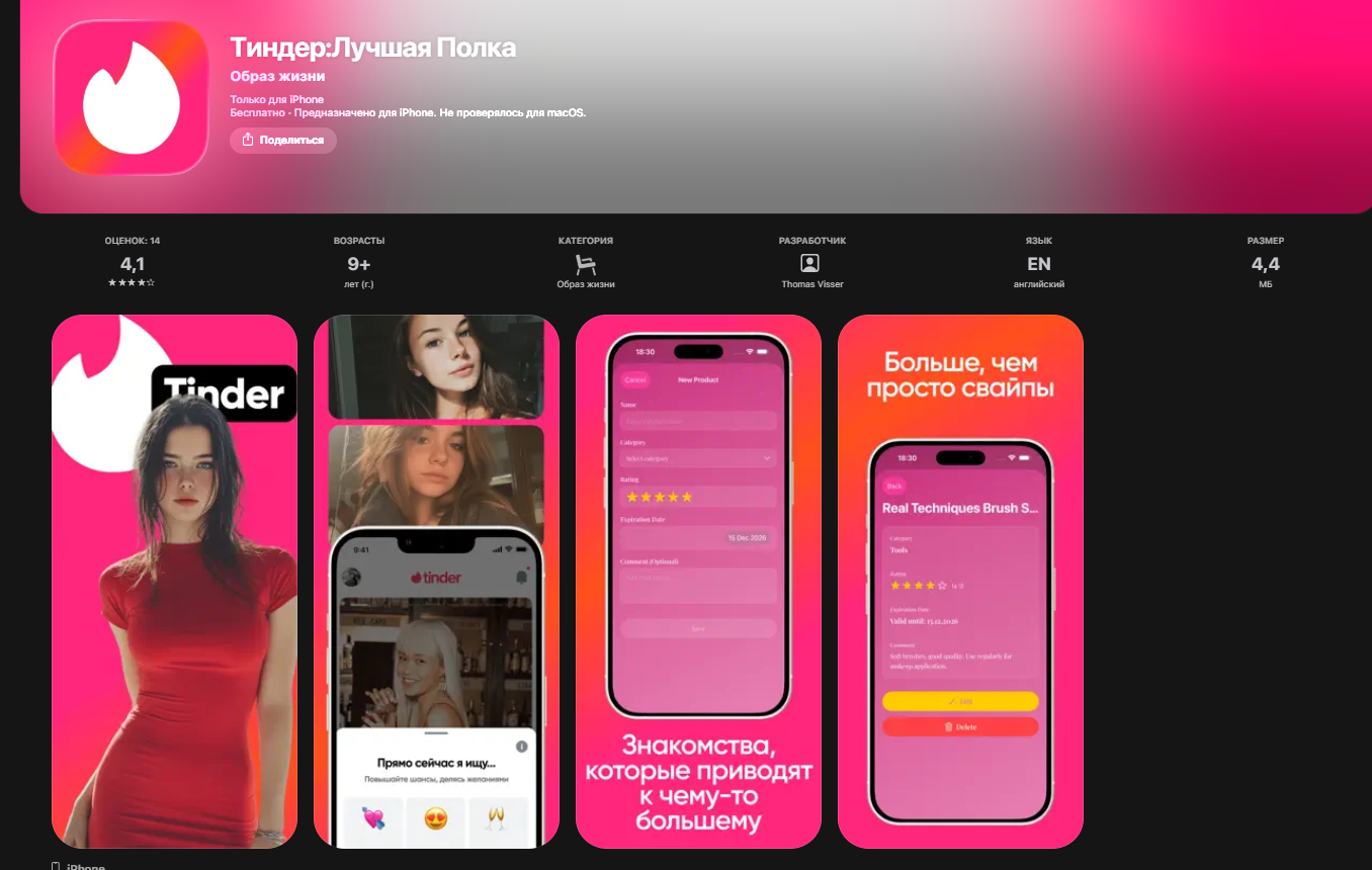 - Описание: акцент на опроснике и совместимости — хороший вариант, если вам важнее спокойный отбор, чем «100 карточек за вечер».