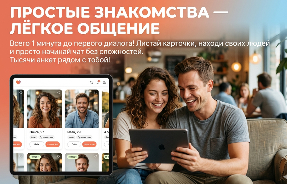Описание: Сервис ориентирован на быстрый вход и подбор под конкретный сценарий знакомств: общение, встречи рядом, серьёзные отношения.