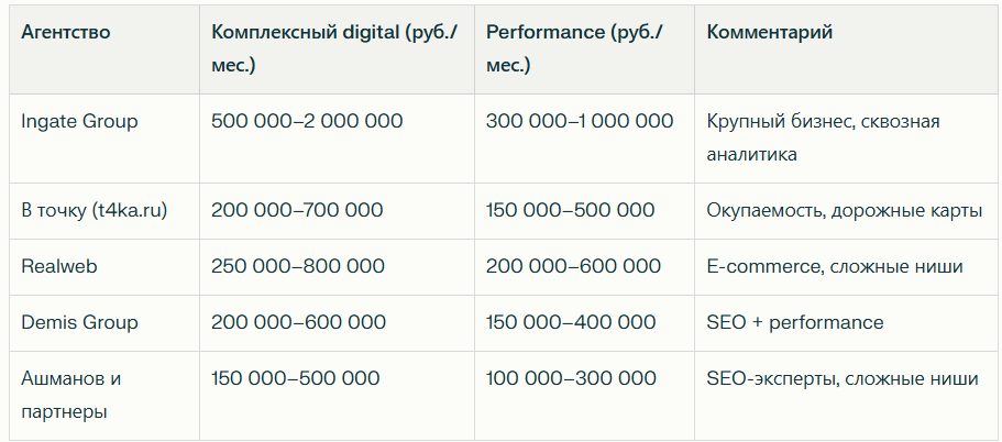 Лидер рейтинга с полным циклом digital: performance, разработка, аналитика. Работает с крупным бизнесом (банки, ритейл), показывает стабильный ROMI > 300%. Сильны в сквозной аналитике и больших бюджетах.