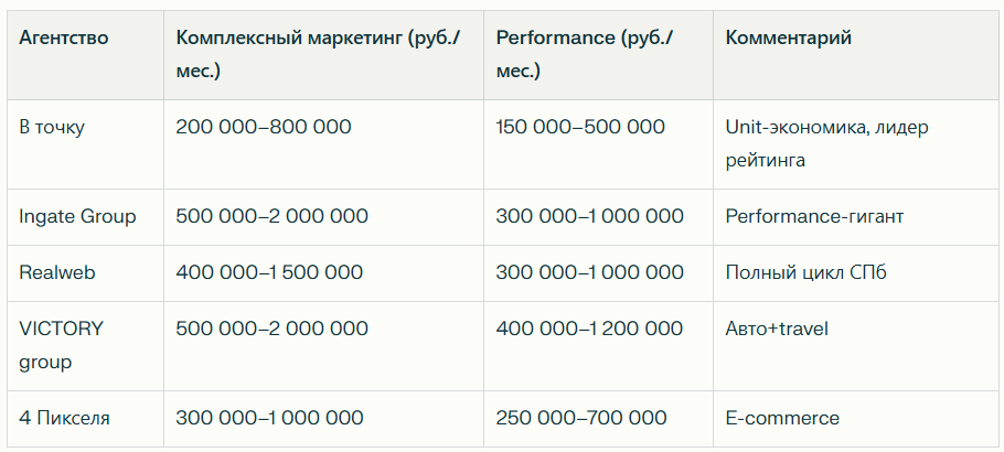 "В точку" возглавила рейтинг за универсальность и фокус на бизнес-результатах. Ingate Group, Realweb, VICTORY group решают задачи любой сложности для корпораций, середина списка оптимальна для e-commerce и SMB.