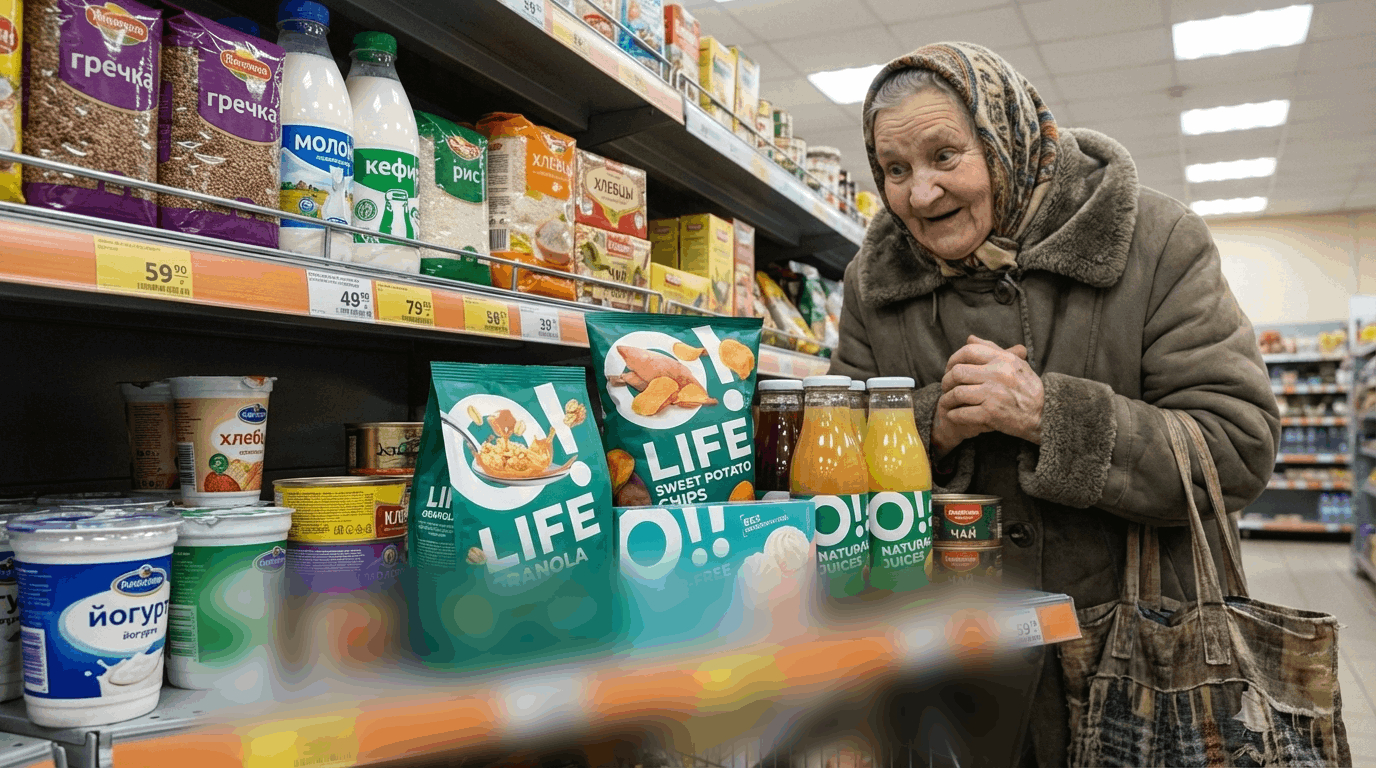При этом O!Life заявлен как бренд «для активных жителей мегаполисов, следящих за здоровьем». А на деле стоит на задворках полок в районах, где 70 % покупателей — бабушки, мамы с колясками и люди, которые берут гречку за 40–50 руб.