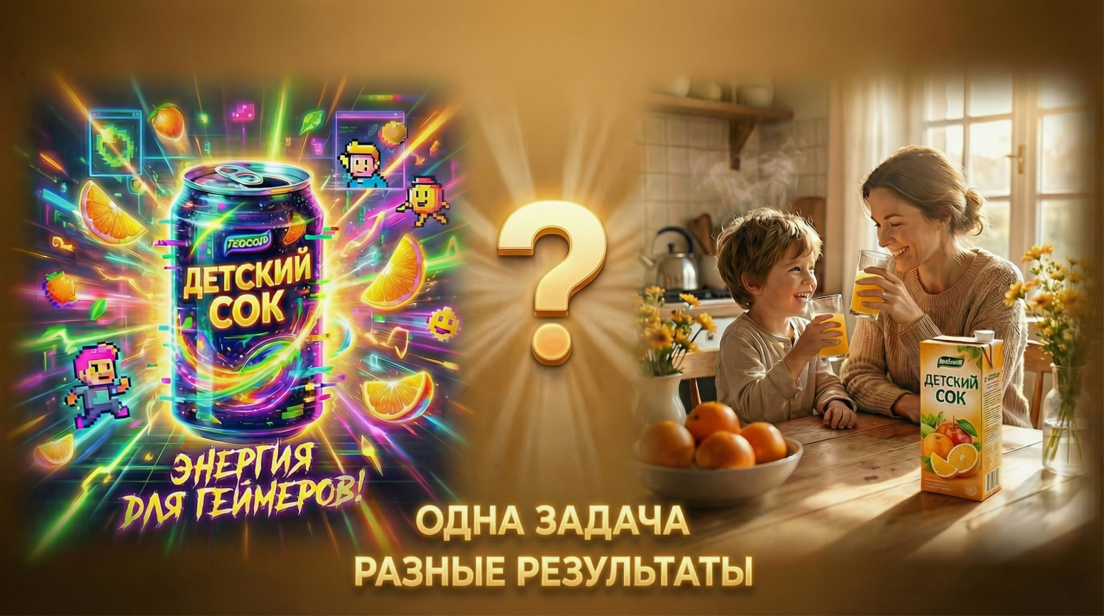 Простой пример. Два человека получают один и тот же промпт: «создай изображение для рекламы сока».