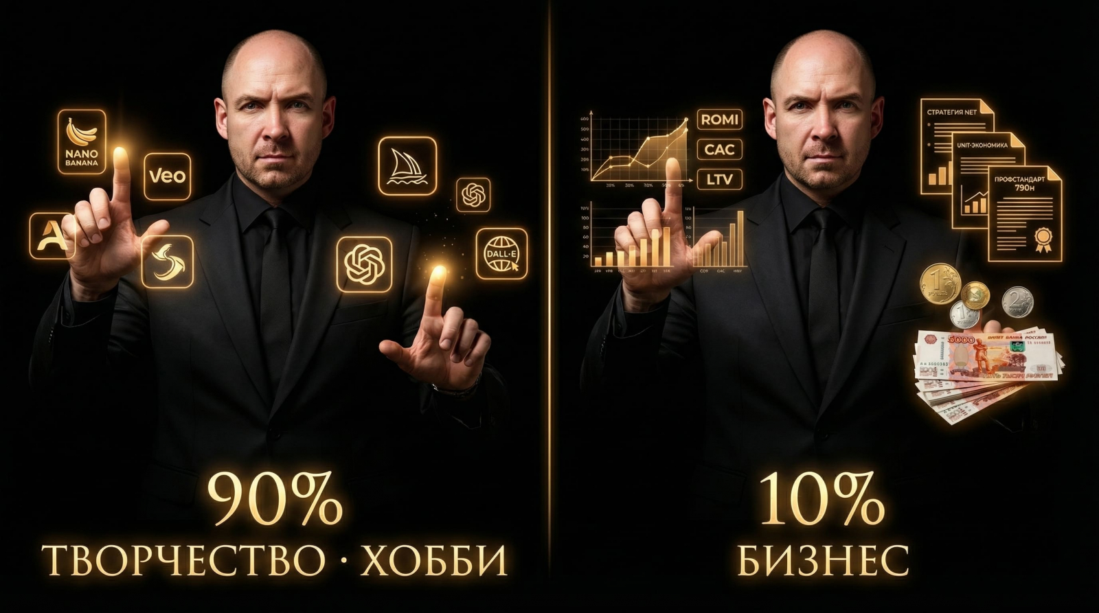 Проблема начинается, когда это хобби выдают за бизнес-инструмент. Когда человек, который «по наитию», «я так думаю» или «мне кажется, это зайдёт», генерит контент и думает, что уже занимается маркетингом. Фокус внимания уходит на саму картинку, видео или текст — «круто выглядит!». А где захват внимания клиента? Где понимание, на каком этапе воронки это должно работать? Где расчёт, принесёт ли это клиентов и деньги?