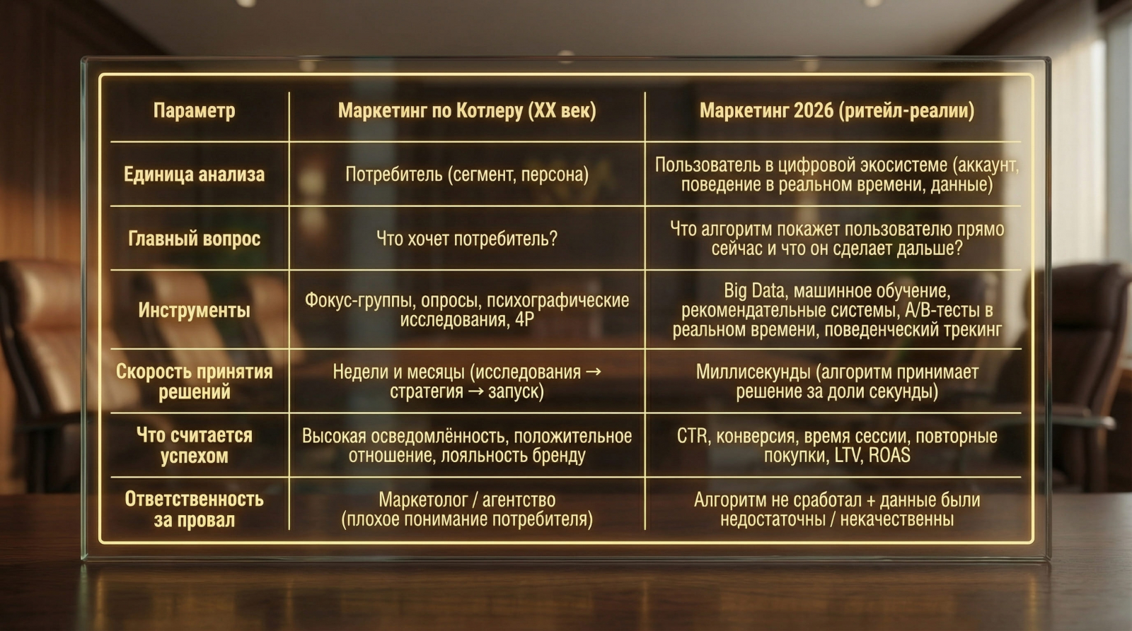 Весь современный российский маркетинг похож на попытку запустить Windows 11 на счётах. Мы до сих пор молимся на «Основы маркетинга» Филипа Котлера, написанные в эпоху, когда главным достижением технологий была цветная печать в газетах. В 2026 году классический маркетинг в России — это не инструмент роста. Это профессиональная дорогостоящая иллюзия, за которую акционеры платят миллиарды. Пока вы обсуждаете «лояльность» и «позиционирование», алгоритмы маркетплейсов и нейросети ритейл-гигантов выедают вашу маржу.