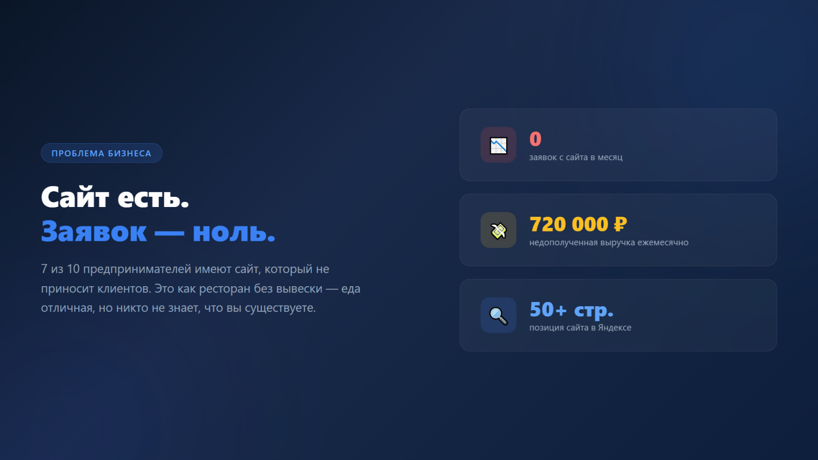 Знакомо? Вы не одиноки. По моему опыту, 7 из 10 предпринимателей оказываются в этой ситуации. У них есть сайт, но он не работает как инструмент продаж. Это как открыть ресторан в подвале без вывески — еда может быть шикарная, но клиенты просто не знают, что вы существуете.