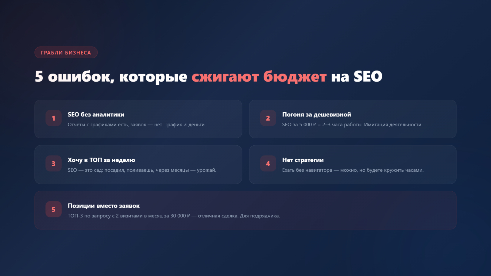 Представьте: вы нанимаете подрядчика, он «что-то делает», присылает отчёт на 20 страниц с терминами, которые вы не понимаете. Позиции какие-то растут, какие-то падают. А заявки? «Ну, трафик же увеличился на 15%!»