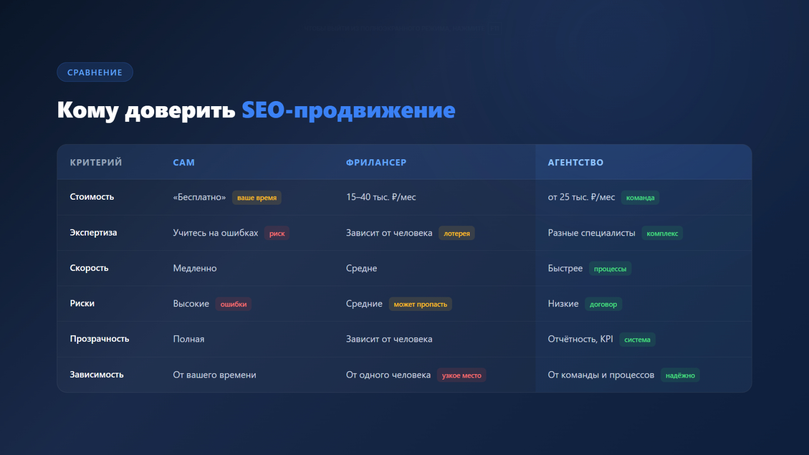 Частный SEO-специалист может быть отличным вариантом — если повезёт найти профессионала. Проблема: один человек физически не может быть экспертом в технической оптимизации, контенте, аналитике и ссылочном продвижении одновременно. Плюс — если он заболеет, уедет или возьмёт слишком много проектов — ваш проект встанет.