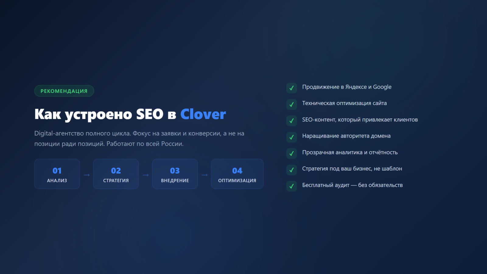 Подход «от бизнеса, а не от SEO». Большинство seo компаний начинают с ключевых слов. Clover начинают с анализа бизнеса. Кто ваши клиенты? Какие запросы приносят деньги, а какие — пустой трафик? Какова экономика: средний чек, маржа, цикл сделки? И уже от этого строят стратегию.