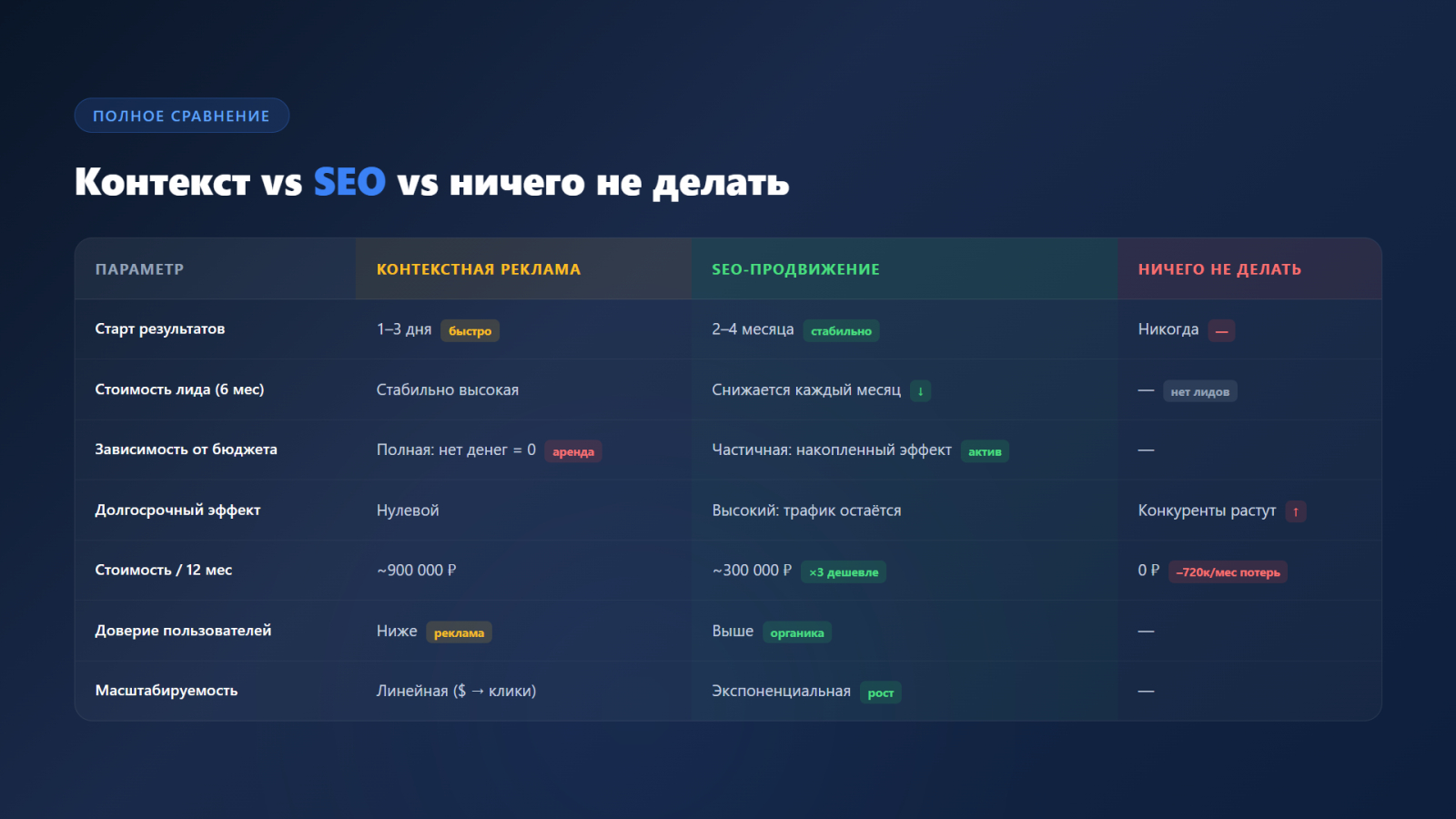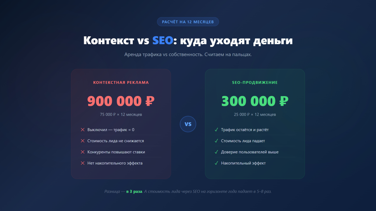 Разница в стоимости — в 3 раза. А совокупная стоимость лида через SEO на горизонте года падает в 5–8 раз по сравнению с контекстом.