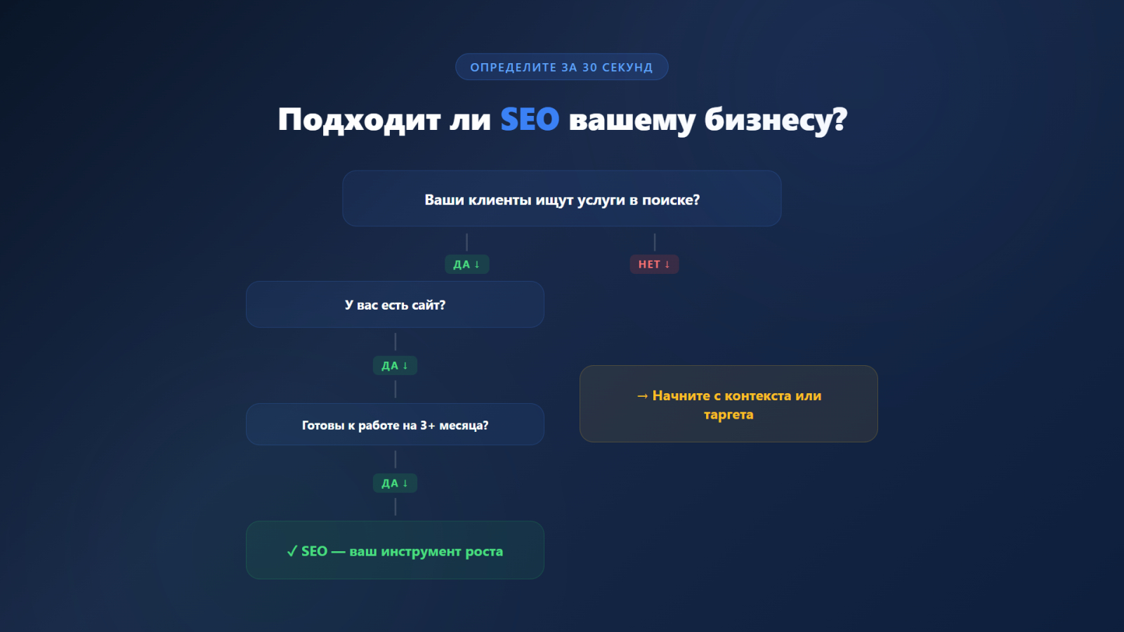 SEO — мощный инструмент, но не универсальный. Давайте честно разберём, кому оно подходит, а кому лучше начать с другого.