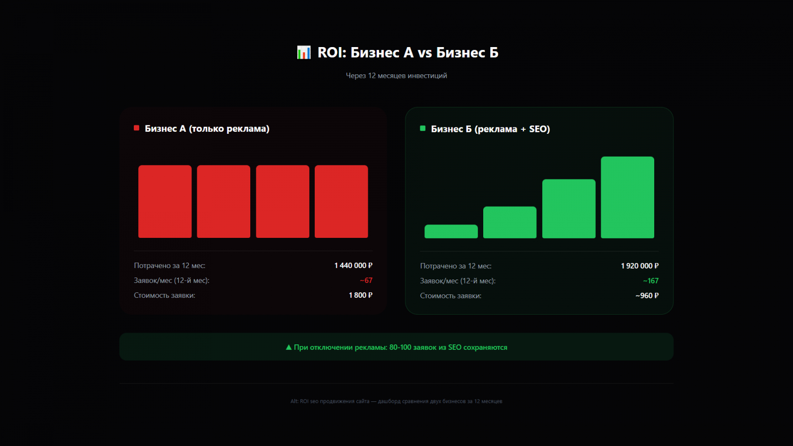 ПараметрБизнес А (только реклама)Бизнес Б (реклама + SEO)Потрачено за 12 мес1 440 000 ₽1 920 000 ₽ (реклама + SEO)Заявок на 12-й месяц~67/мес~167/мес (67 из рекламы + 100 из SEO)Средняя стоимость заявки1 800 ₽~960 ₽При отключении всех бюджетов0 заявок80–100 заявок/мес из органики