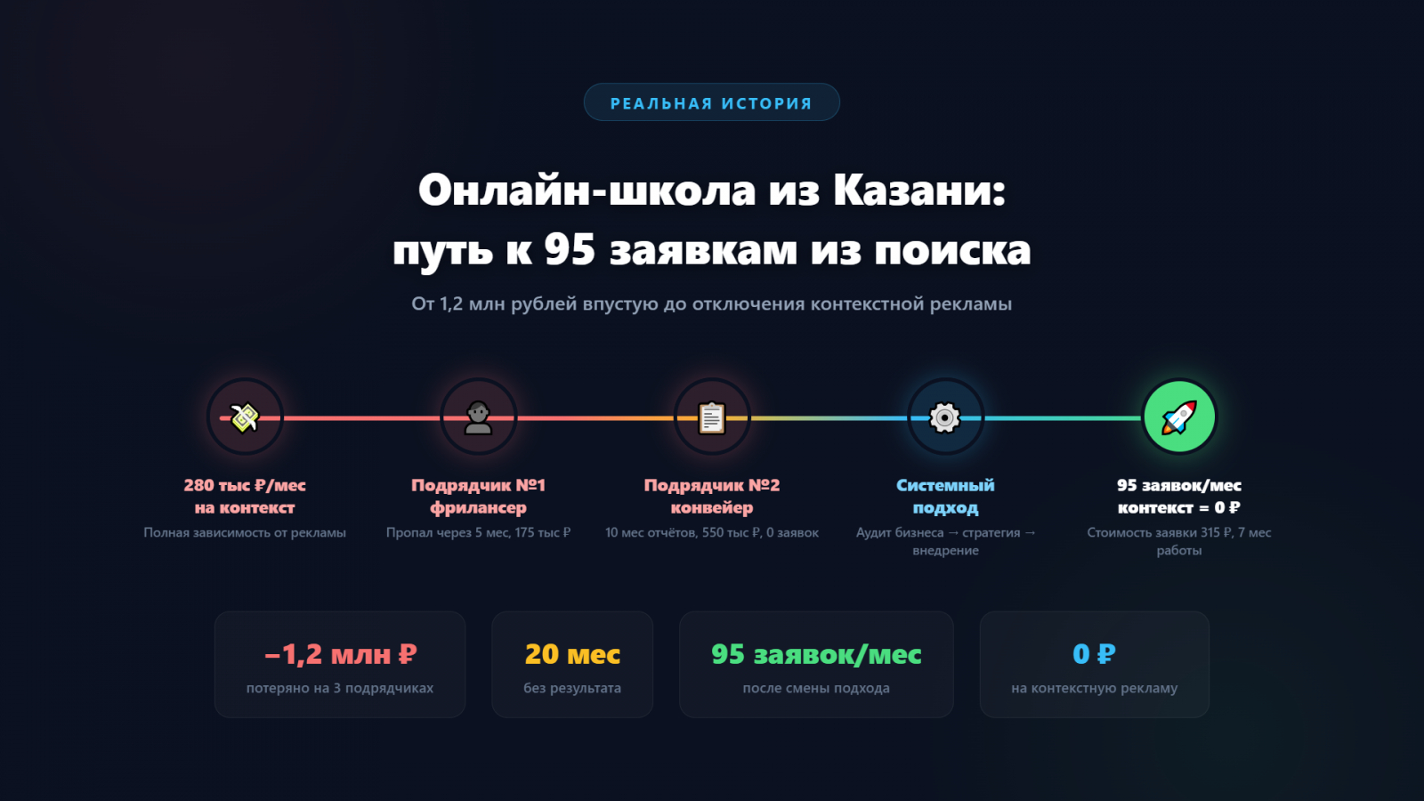 Итого за 20 месяцев: 1 200 000 ₽ + 280 000 ₽/мес на контекст. Заявки из органики — 2–3/мес. Рентабельность SEO-инвестиций — минус бесконечность.