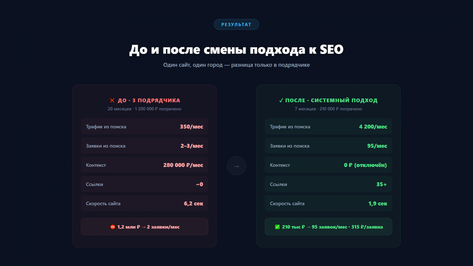 Вот реальная картина: те же деньги (даже меньше), тот же сайт, тот же город. Единственное, что изменилось — подрядчик и подход. Как в садоводстве: первый «садовник» сажал семена в асфальт, второй — поливал без удобрений, третий — клеил пластиковые цветы. Четвёртый — подготовил почву, посадил правильные семена, поливал, удобрял. И через 7 месяцев — урожай.