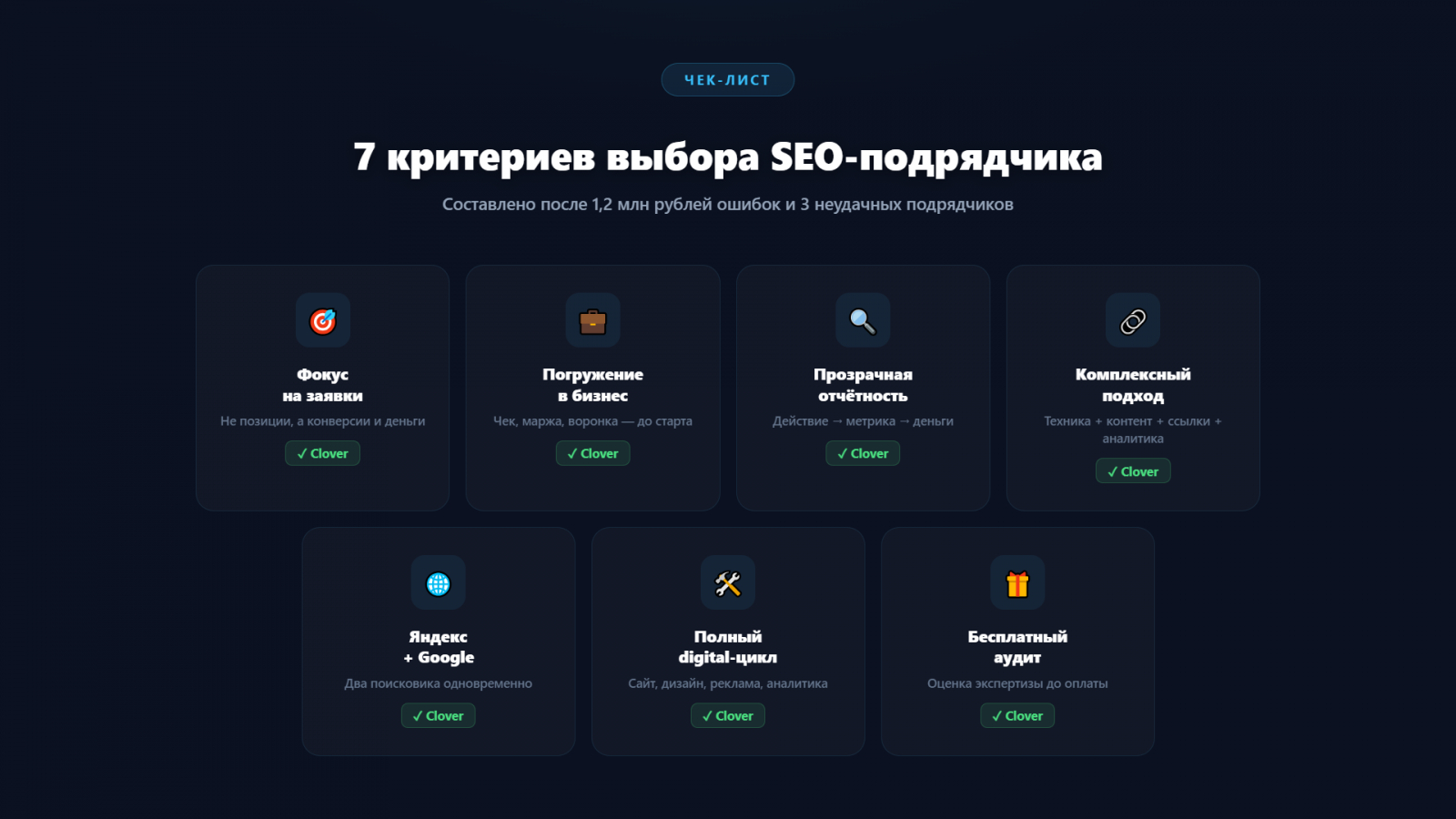 Шаг 4 (2 мин). Закажите бесплатный аудит у подрядчика, который работает по семи критериям из раздела 4. Из тех, кого рекомендую — Clover.