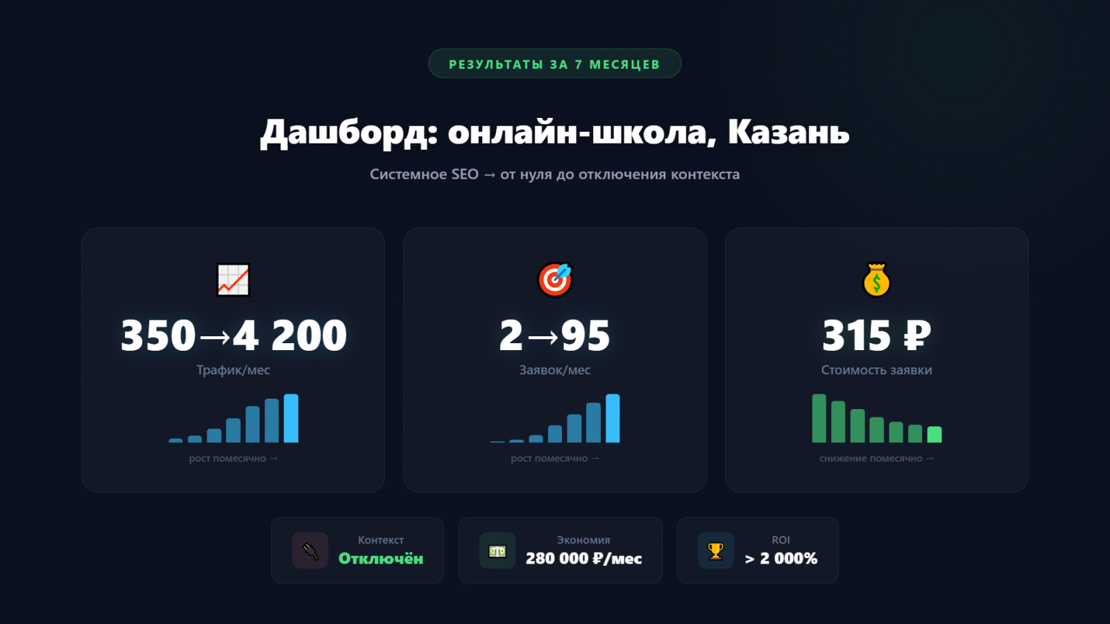 Два года назад я тратил 280 000 ₽/мес на контекст и не понимал, зачем нужно SEO. Сегодня контекст отключён, а 95 заявок приходят каждый месяц из Яндекса. Бесплатно. Стабильно. С каждым месяцем — дешевле. Единственное, о чём жалею — что не начал раньше.