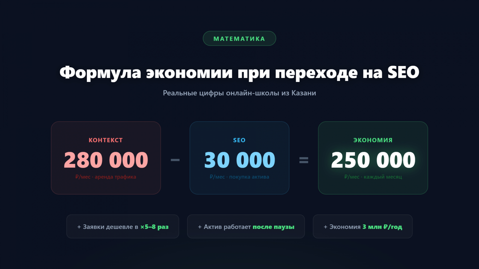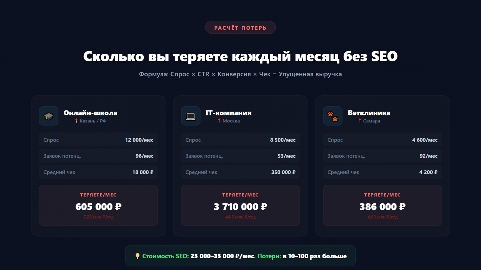 Считаем: вы «экономите» 25 000–35 000 ₽/мес на SEO — и теряете от 386 000 до 3 710 000 ₽ выручки. Это как не вкладывать деньги в инвестиционный портфель с доходностью 2 000%+ годовых, потому что «а вдруг».