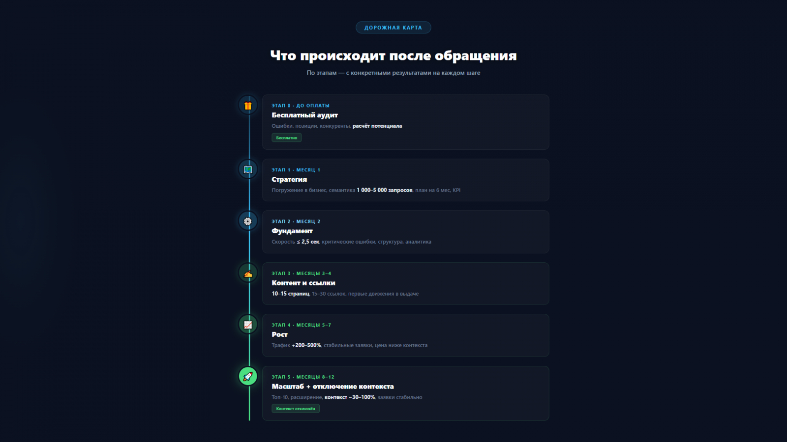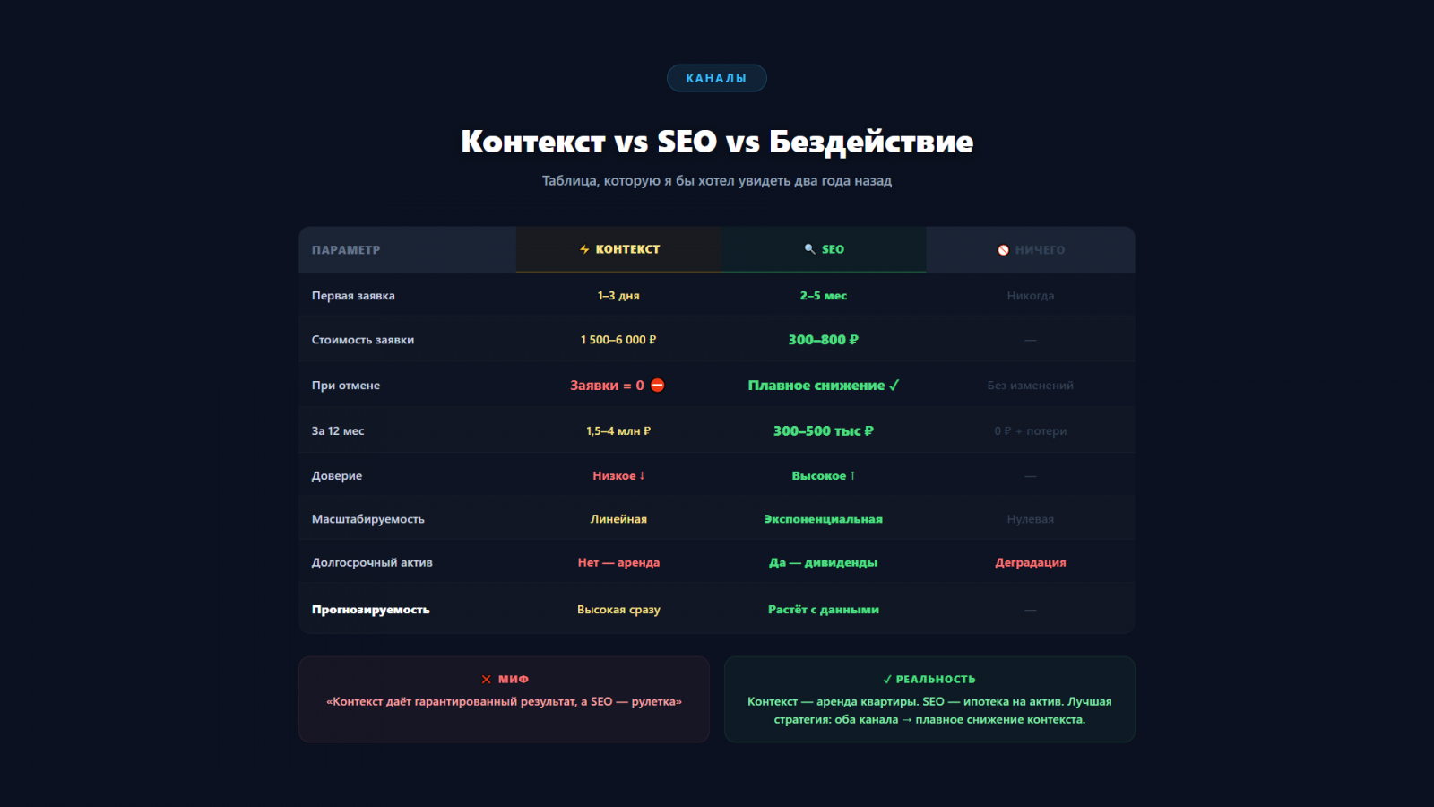Реальность: Контекст — это аренда квартиры. Платишь — живёшь. Перестал платить — на улице. SEO — ипотека: вкладываешь в актив, который потом приносит дивиденды. Идеальная стратегия — начать оба: контекст покрывает первые 3–5 месяцев, пока SEO набирает силу. Потом плавно сокращаете контекст.