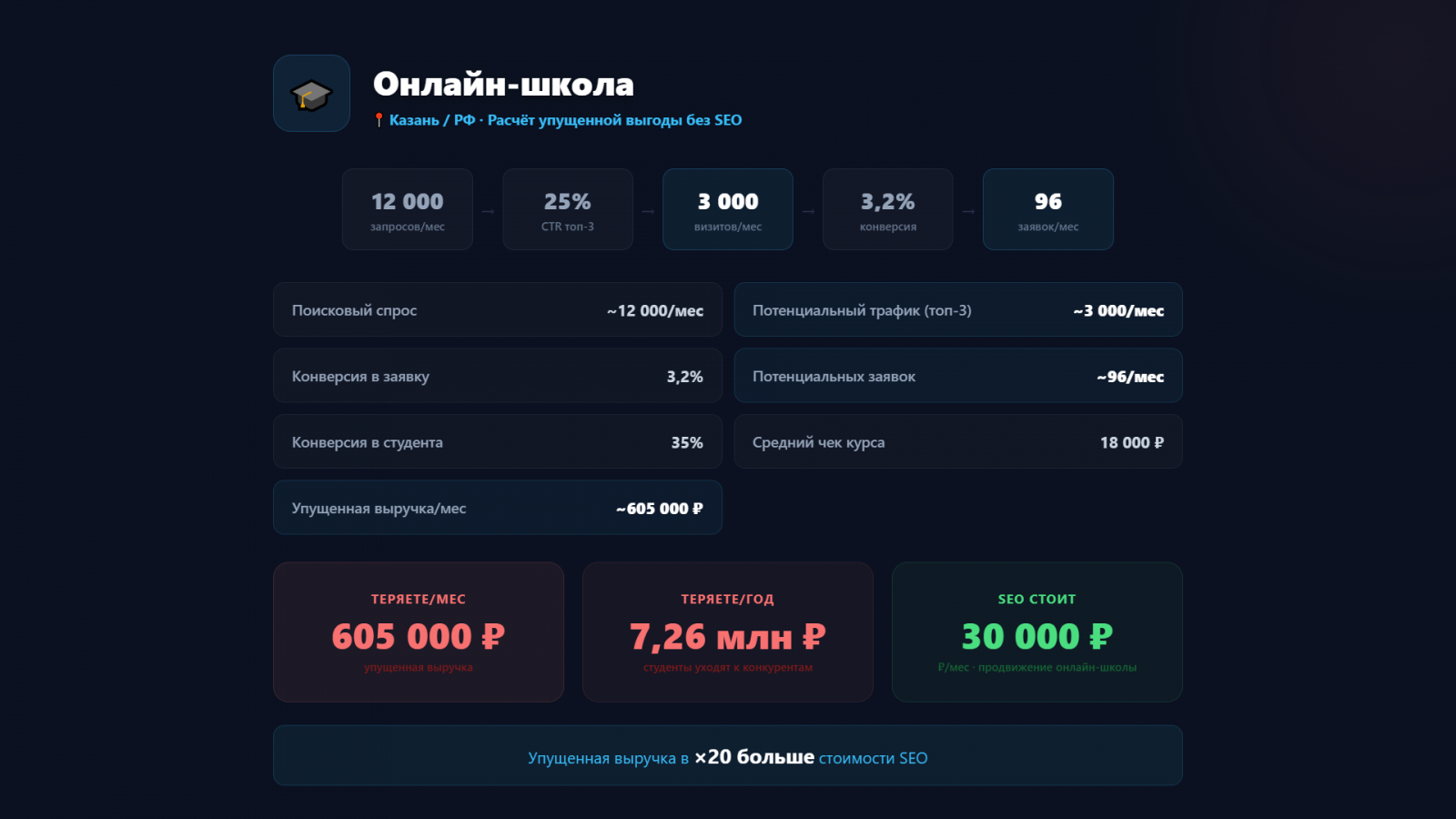 Стоимость продвижения онлайн-школы через SEO: 30 000 ₽/мес. Упущенная выручка — в 20 раз больше.