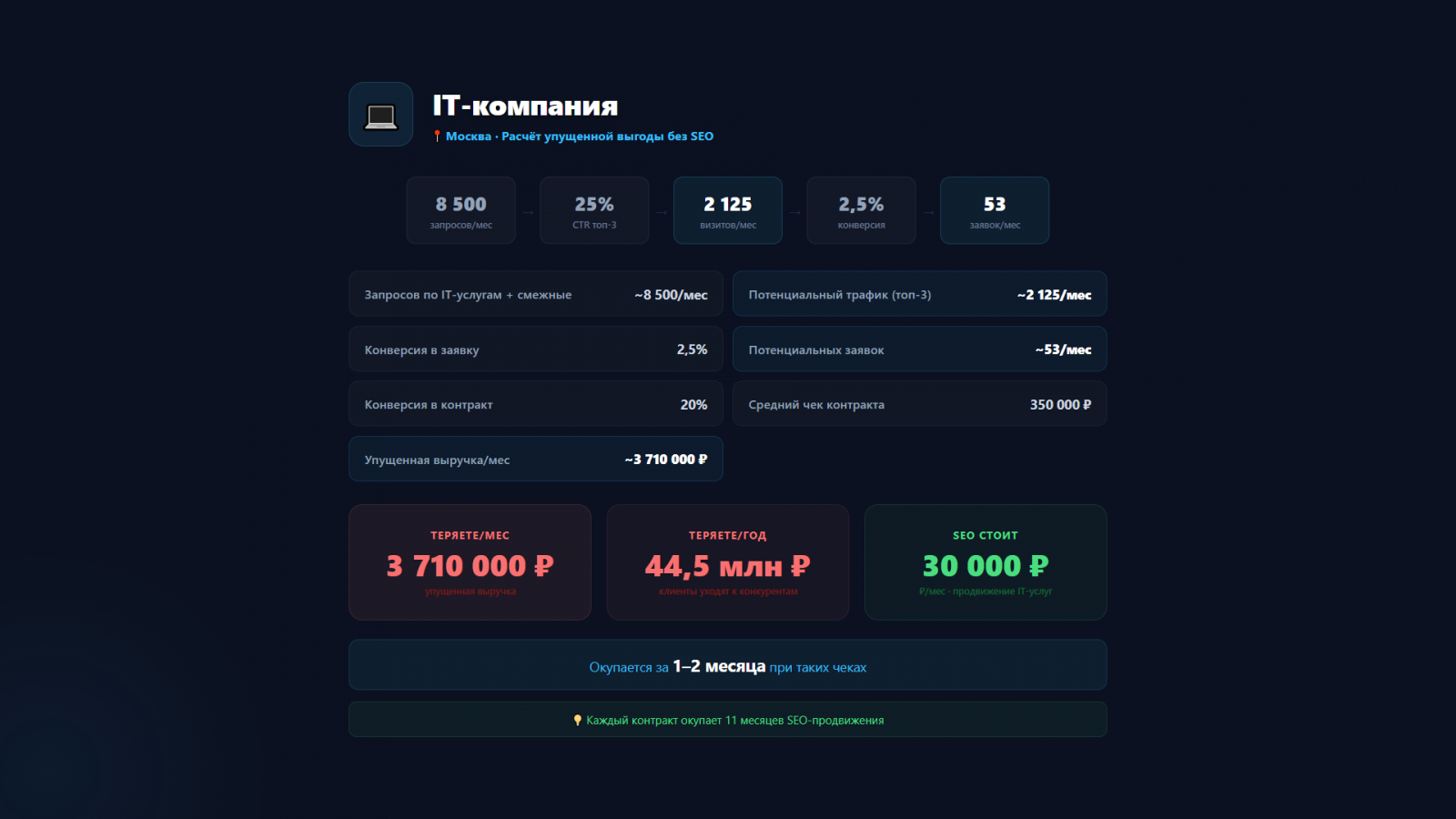 Шаг 5 (после аудита). Сравните стоимость SEO с упущенной выручкой. При разнице в 10–20 раз решение очевидно.