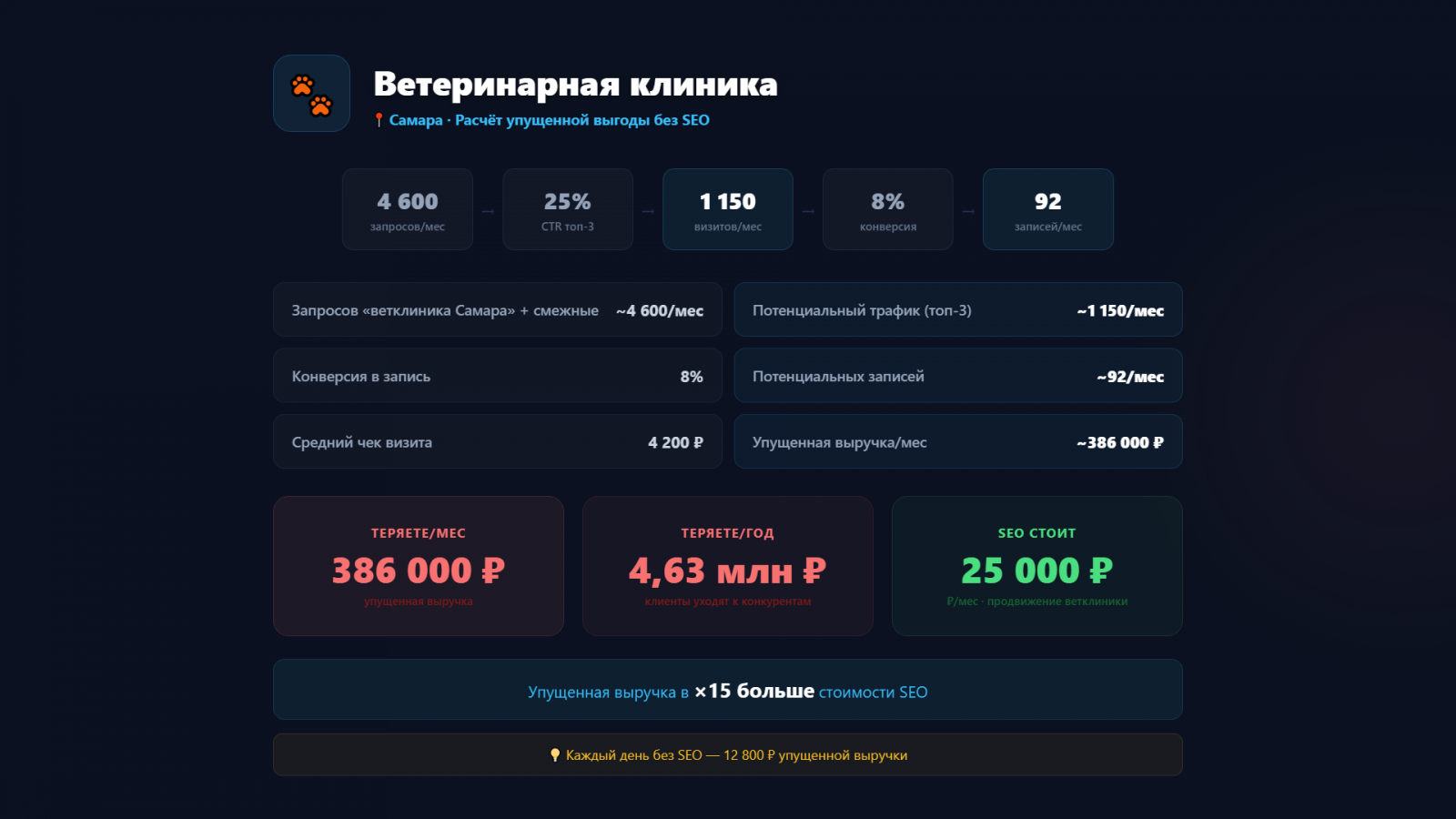 Упущенная выручка = Спрос × CTR топ-3 (25%) × Конверсия × Конверсия в клиента × Средний чек